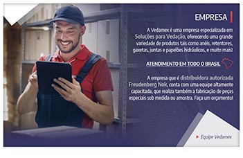 Localizada em Uberlândia-MG, a Vedamex é uma empresa especializada em Soluções para Vedação que atende todo o país, oferecendo uma grande variedade de produtos tais como anéis, gaxetas, retentores, juntas e papelões hidráulicos, cupilhas, válvulas e muito mais!